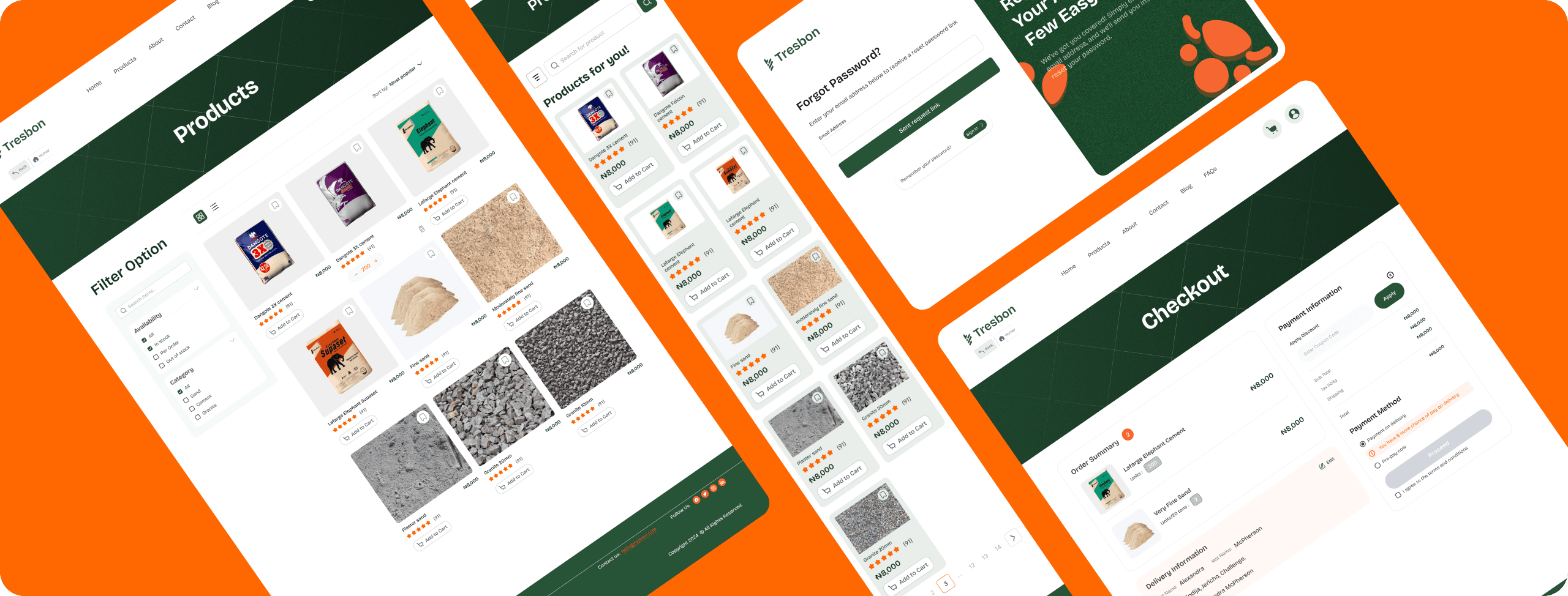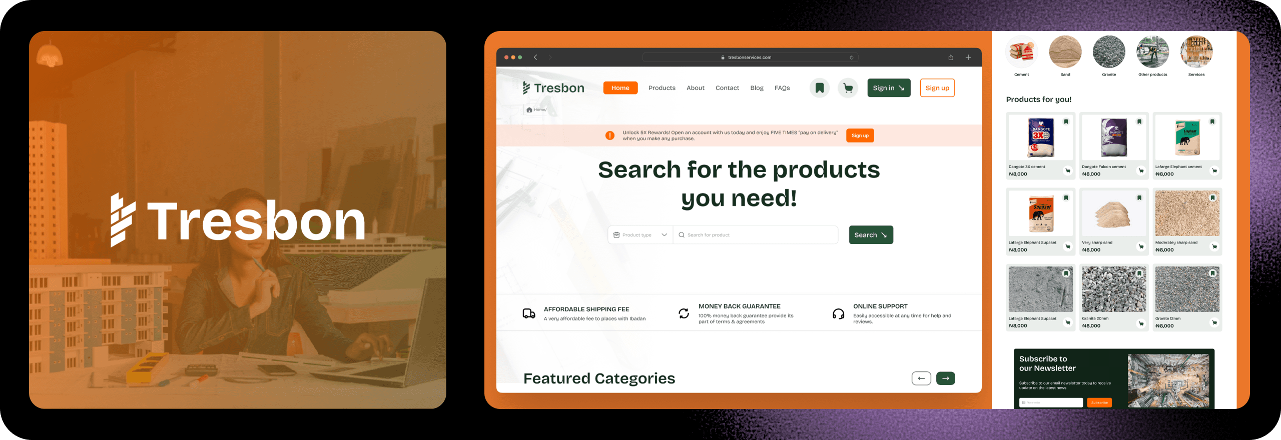 Tresbon Construction Services is a growing construction brand in Nigeria transitioning from subcontracting to a modern construction materials supplier. The project involved launching a new e-commerce platform and brand identity to improve the purchasing experience for builders, contractors, and homeowners.
